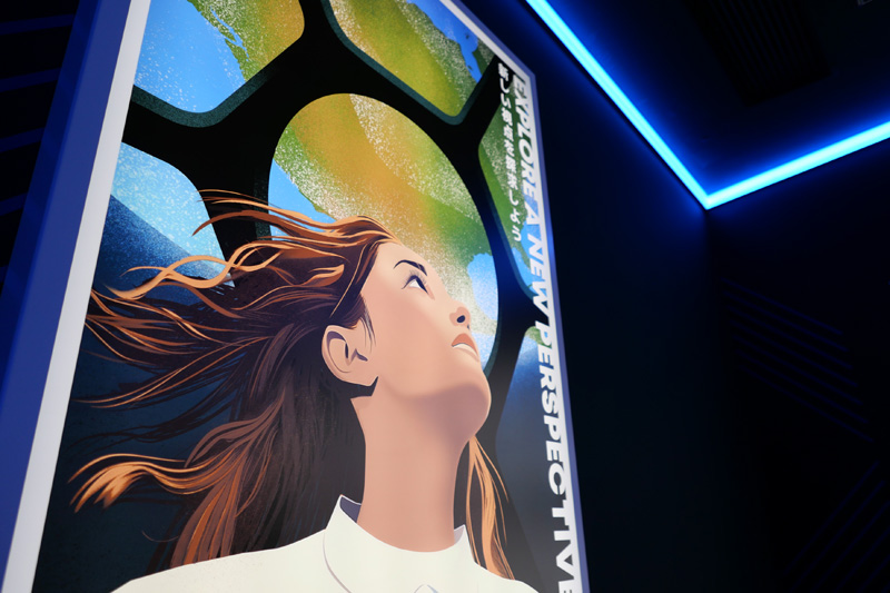 こちらは今回のアメリカ館で見た展示パネル。同館は展示の多くを、アメリカが海外の若者に開かれた留学の場を提供していることのアピールに割いていて、このパネルにも「新しい視点を探求しよう」と書いてあります。若者のイラストは新しい学びへの希望に燃えているようです。