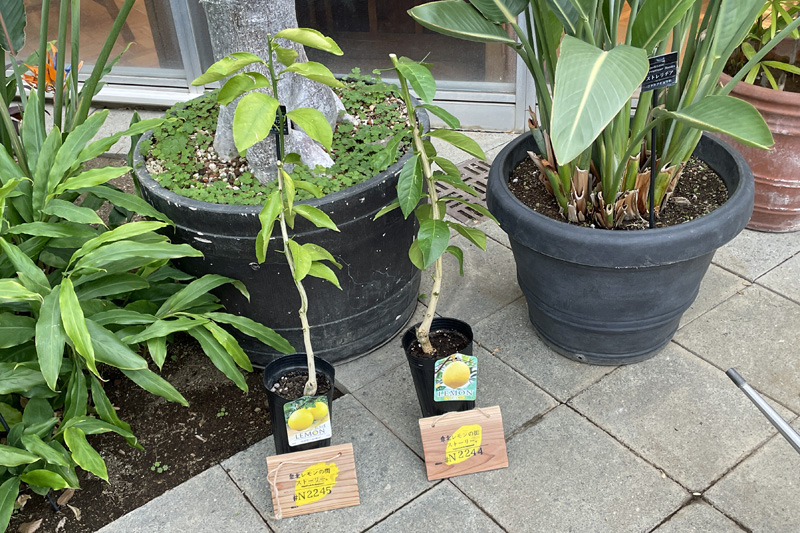 桜も咲き始めた多摩中央公園はお気に入りの場所ですがその一角、多摩市立グリーンライブセンターに、おや?見たことあるような札を下げたレモンの苗木が2株…