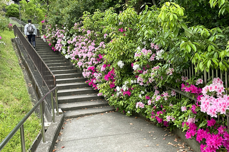 ヒーターもしまわないうちに季節は進み、GW前。OPH北千里駅前内の遊歩道「ふれあいの道」にも、柵のすきまからツツジがにじみ出して自己主張しております。